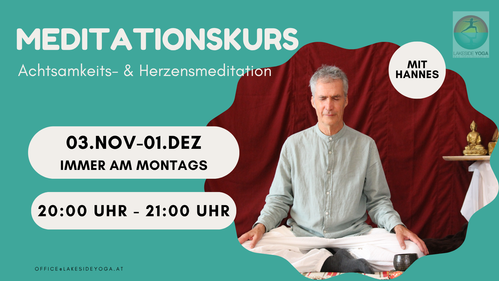 Eine praktische Einführung in Achtsamkeitsmeditation, lebensnah und relevant vermittelt. Gewahrsein des Atems bildet den Fokus und hilft sich zu zentrieren. Darüber hinaus entwickeln wir Achtsamkeit gegenüber Gedanken, Gefühlen, Körperempfindungen und Sinneseindrücken.